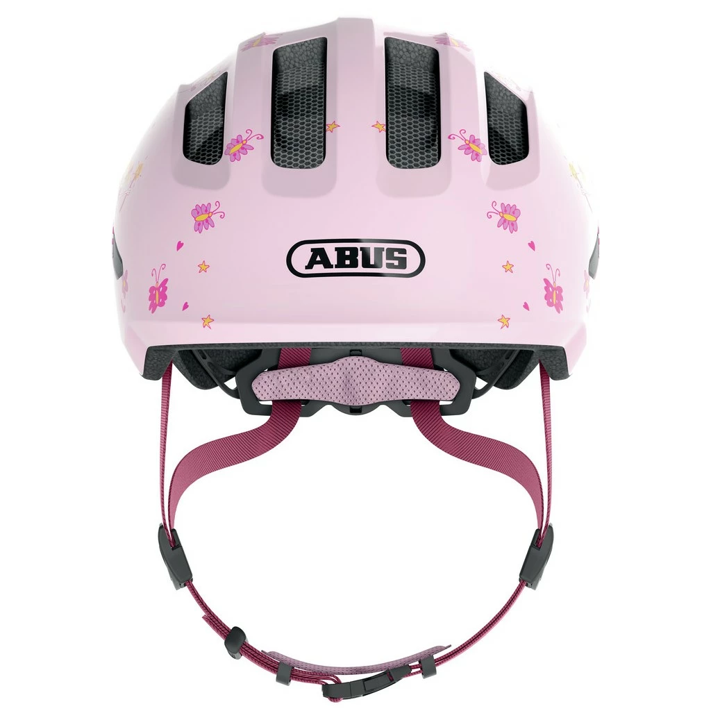 Hjelmen justeres ved hjælp af Zoom Evo justeringshjulet og der er samtidig plads til en hestehale hos børn med langt hår. Børnehjelmen har otte lufthuller og et indbygget fluenet, så der er god ventilation uden du risikerer der flyver insekter ind under hjelmen. ABUS Smiley 3.0 er udstyret med bløde stropper og et klassisk hagespænde. Den bløde polstring i hjelmen kan tages ud og vaskes